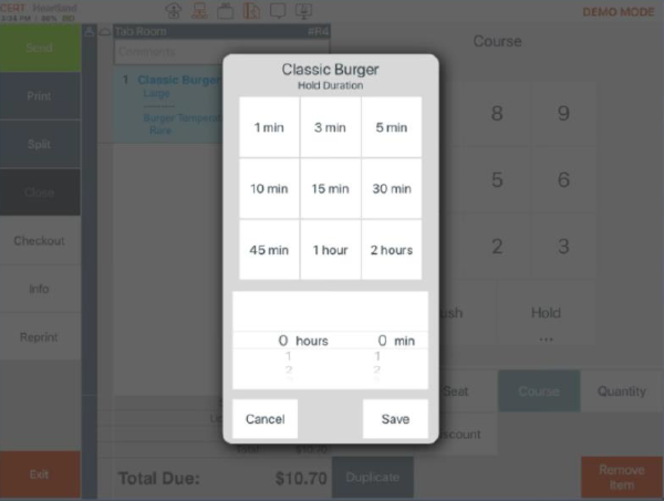 With the Heartland Restaurant POS app, Servers and Bartenders can now place items on hold and choose when to have the item automatically be sent to the kitchen or bar.