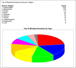 The best part of the monthly service is having the assurance that intrusions are being prevented from penetrating your network. Using a patented communications protocal, the firewall securely sends traffic information to our Cloud Management System every few minutes. The data is used to generate graphical reports about the network, including data use by user and timeframe, intrusion attempts and network traffic. You and/or your team will automatically receive a monthly report showing report history, including the number of intrusions prevented by region around the globe.