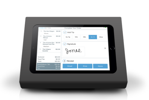 The guest interacts directly with the display to select a tip amount and sign on the iPad for signature capture. Your guest then has the option of choosing to email, print or decline a receipt.